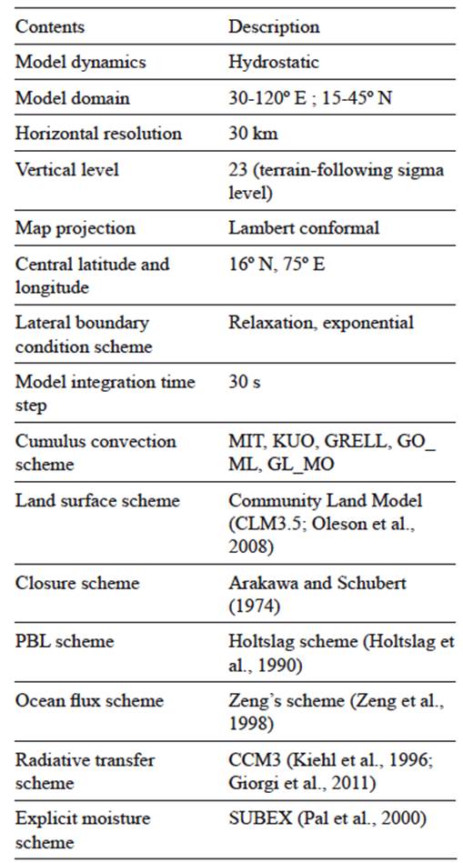 The configuration of the model used in the present study is given in Table I. The model domain ranges from 30-120º E, 15º S-45º N with 30-km horizontal resolution and 23 vertical levels (Fig. 1). The initial and lateral boundary conditions are provided by global reanalysis datasets. Similar to the other regional model, RegCM4 is employed with a buffer zone of 12 grid points inside the lateral boundary (Wang et al., 2003; Giorgi et al., 2011). Different prognostic variables of the model, such as wind components, temperature, water vapor, etc., are nudged to the reanalysis data with an exponential nudging technique. The polygon inside the model domain (Fig. 1) represents the buffer zone selected for this study.