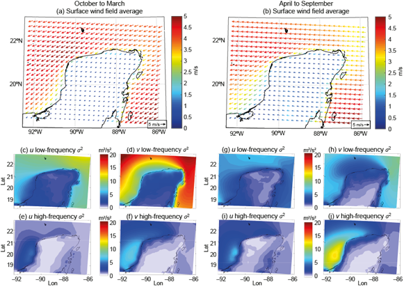 The computed variance of the low (≥ 32 h) and high-pass (< 32 h) filtered zonal and meridional winds from the NAM can be used to provide insights about the spatial distribution of the phenomena that affect the average wind field patterns. For instance, in Figure 3c, d, the variance from Oct-Mar of the low-pass filtered horizontal components is depicted, and in Figure 3g, h, the same statistic for the period Apr-Sep is shown. These results show that most of the variability is present in the meridional component during the cold front season and it is located at the northwestern and northeastern shelf of YP, diminishing equatorward over the inland landmass. This spatial behavior indicates that the synopticity is higher from Oct-Mar presumably attributed to cold fronts. The greater meridional low-frequency energy of all the power spectra estimated from observations (Fig. 2 and SM) reinforces this idea. Also, the co-spectra of the LF-measured winds has the highest shared-energy in the northernmost oriented sites (PER-SIS), presumably showing stronger cold front influence (see SM).