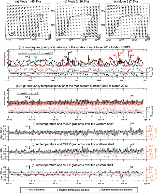 Even though modes 1 and 2 show a predominant synoptic (LF) flow (Fig. 4a and b, respectively), their associated HF time series also contain a clear diurnal pattern. The periods of large-amplitude oscillations in the LF of mode 1 (Fig. 4d) coincide with periods of small-amplitude oscillations in the HF for the same mode (Fig. 4e). For instance, during the events w1 and w5 in Figure 4d, the air-temperature gradients over the YP shelf were damped indicating a cooling effect (see Fig. 4f-h; notice that w5 was a stronger front). Conversely, Figure 4e shows that the periods of amplification of the HF correspond to periods of little synoptic influence, indicating synchronization of the modes and that the HF are modulated (reduced) by the frontal influence. In the interannual scale, this modulation is noticeable during the seasons of increased cold front activity (for instance, 2009-2010 and 2015-2016; see SM).