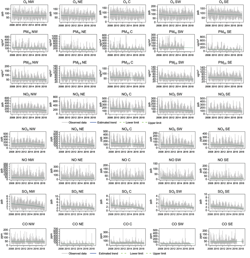 Despite the absence of data for PM10 and PM2.5 at the end of the study period and exclusively for the southwest region, the model was able to perform the respective trend of estimates and intervals up to October 2018. NO2 and CO show clear decreasing trends, while PM10 and NOx show a similar pattern in their trends, although with differentiated maxima concentration levels. It can also be observed that, despite the fact that SO2 starts with a marked growing trend, this becomes slower in the course of time. With regard to O3, unlike PM2.5 it starts with a decreasing trend and then reverses in 2014.