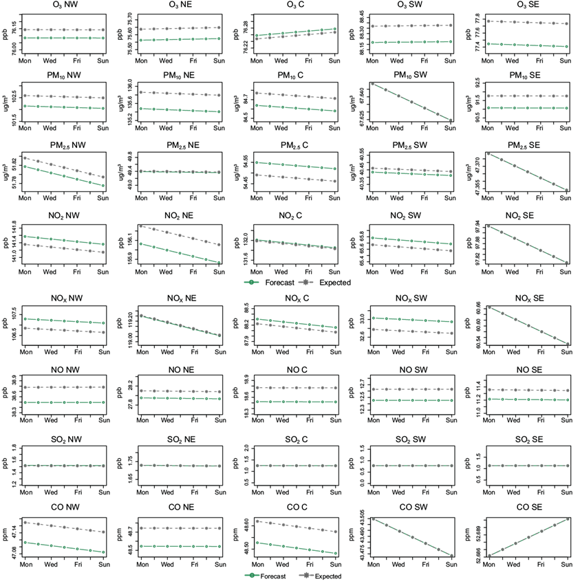 The forecasts presented here are based on trend estimates, so they do not reflect point estimates; however, the trend forecast of the period from October 26 to 31, 2018 verifies that the forecasts are numerically close to the expected values for each pollutant and region. Finally, it is considered that this type of statistical tool would be useful for decision makers regarding air pollution issues. It would be desirable as a future line of research to estimate the trends and forecasts of the eight pollutants, considering their seasonality.