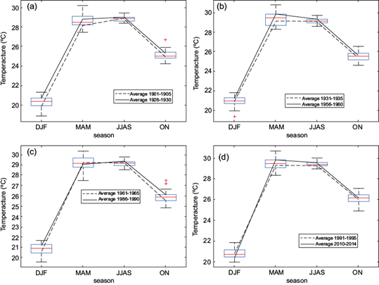 The average temperature and rainfall of the first and last five years of the above 30-year time span have also been shown for different seasons. It is evident from Figure 1 that the average temperature value for DJF, indicated by the red line in the box plot of temperature lies in the middle of the upper and lower bound of this parameter for the periods 1901-1930, 1931-1960, and 1961-1990; however, for the period 1991-2014 the average value is nearer to the lower limit. For MAM, the average value is closer to the lower and upper bounds for the periods 1901-1930 and 1931-1960, respectively. For JJAS, the average value is closer to the upper limit for the periods 1901-1930 and 1961-1990, and to the lower limit for the period 1991-2014.