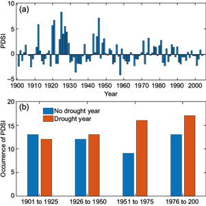 As an indicator of meteorological drought over this region, analysis of the PDSI indicates that though the number of years with dry conditions has increased, the intensity of dryness has decreased.