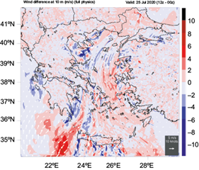 Figure 10 provides numerous inferences to prove the contribution of sea breeze to the diurnal variation of Etesian winds type A. However, although the main goal of this paper seems to be succeeded, some more demonstration is necessary to advocate it. Although Figures 10 and 11 would be expected similar to each other, they display some variations. Before we attempt to elucidate them, we have to interpret the sort of atmospheric circulations that the Figures display. The nofflx meteorological fields during the whole simulation time are almost unchanged following the initial values influenced slightly by the lateral boundary values. We can say that the nofflx wind field is the sum of the Etesian wind and the 00:00 UTC on July’s 24, 2020 land breeze. Therefore, its time small variations seen in a variety of places (Fig. 12) are Etesian winds variations or IO and mechanical turbulence. The author’s aspect is that WRF-ARW is very sensitive to the transformation of the flow from balance to unbalance responding to an IO starting. Really, Figure 12 shows almost zero to slight differences, which could be attributed to mechanical turbulence and/or nocturnal IO except for the southwest part of Greece. As we have already justified the existence of the blue lane field in Figure 10, we are able to explain the red color of almost the same region. As both wind fields are nofflx, the red color means that the nighttime northerly is stronger than the previous daytime one. The resulting difference is due to synoptic scale pressure gradient or to nocturnal IO, since the land breeze difference is zero. Looking at both fields separately we realize that the winds at 12:00 UTC have changed mostly to south-southwest. This usually occurs when a subtropical anticyclone extends from south toward Greece. It is now time to address the differences between Figures 10 and 11. Figure 11 depicts a wind difference field, which can be adopted easily by two initial analyses or reanalyses with better results than these of the forecast fields in Figure 11. In both figures the wind differences shown correspond to sea breeze, except for the southwest part for the above-mentioned reasons.