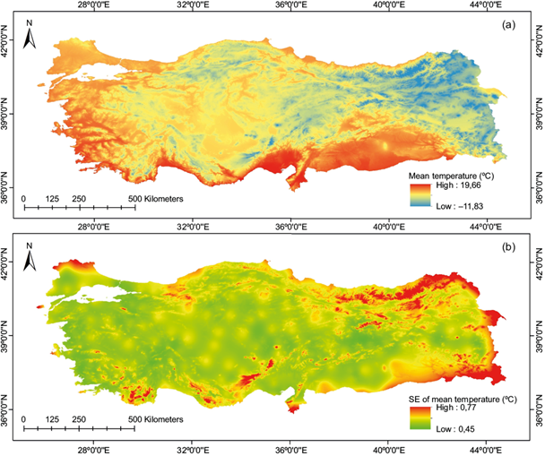 In this study, Turkey was examined as the case study because it is a developing country with a scarce monitoring station network. Therefore, climate maps are required to obtain accurate, reliable data. By combining high-resolution climate maps with temporal dimensions, such datasets could be a critical tool for monitoring and determining global climate change and meteorological disaster risk in the country (McKenney et al., 2006; Huayang et al., 2019). Similar interpolation studies have been performed in Turkey to fulfill the needs of different methods (Apaydin et al., 2004; Bostan et al., 2012; Güler and Kara, 2014; Aydin et al., 2016; Tanir and Zengin, 2016). However, none of these studies used ANUSPLIN to model climate data, such as temperature and precipitation.
