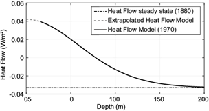 Table I Characteristic values of the subsurface temperature and heat flow as described in the text. The time t details the year where the temperature curve behavior was compared with respect to the linear (steady state) behavior at high depths (the year 1880, imposing the condition of a difference in temperature equal to 0.01 ºC).