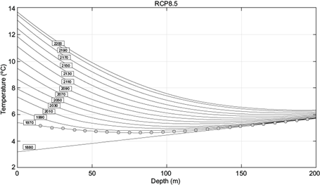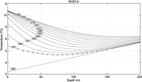 Figure 3 presents the time evolution of sub-surface temperature at Kapuskasing, Canada, subject to surface temperature boundary conditions as described in the text and an RCP8.5 future scenario, for the years 1880 (straight line), 1970 (solid curve almost coinciding with the measured points), 1990-2190 (one solid curve every 20 years corresponding to surface temperature as boundary conditions of increasing values), and 2200. The large impact attributed to climate change near surface is evident since the temperature boundary condition on surface has the largest expected difference of all scenarios (with a value of 8.3 ºC, see Table II) in the 1970-2200 period. At the largest analyzed depth (z = 200 m), the perturbation due to the external surface driver is rather small (0.7 ºC).