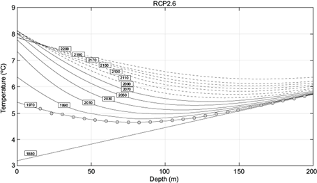 Figure 6 has a similar behavior as Figure 3 for the RCP2.6 future scenario, except for the period 2090-2190 (one solid broken curve every 20 years) and the year 2200. In these cases, a particular behavior can be observed, since near surface the evolution of sub-surface temperature does not follow the constant increase at all depths, as in the other three scenarios. This effect is because surface temperature verifies boundary (at surface) conditions of decreasing values after passing a maximum around year 2070.