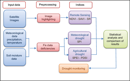 In recent decades, due to the limitations of drought monitoring using climatic and hydrological indices (including the spatial distribution of meteorological and hydrometric stations, especially in arid areas), remote sensing (RS) techniques have been considered (Ebrahimi et al., 2010; Heim, 2002). Accurate image processing and calculating indices can improve the model efficiency for drought prediction (Rhee et al., 2010).