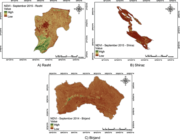 The results of the SAVI index (0.37 in Rasht [September 2015], 0.16 in Shiraz [September 2015], and 0.15 in Birjand [September 2014]) indicate a more severe drought situation in these areas (Fig. 5). This study’s results are in line with the findings of Fadaei (2018) and Mirmousavi et al. (2010), who obtained good results using this index in connection with the analysis of agricultural drought.