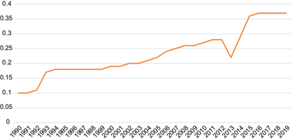 Fig. 8 Historical waste greenhouse gases emissions,1990-2019 (in t CO2e per capita).