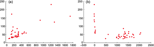 Fig. 7 Scatter plots between (a) annual precipitation and maximum daily values estimated with the Generalized Extreme Values (GEV) distribution for a return period of 10 years and (b) altitude and maximum daily values calculated with the GEV distribution for a return period of 10 years.