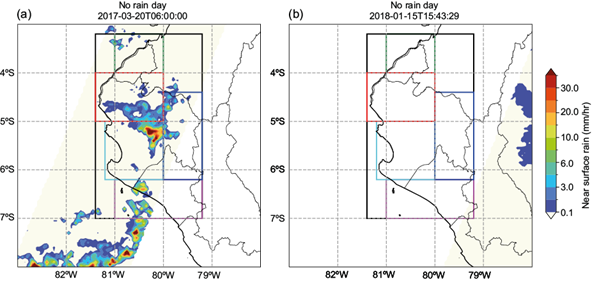 Fig. 2 Examples of (a) “rainy day” and (b) “non-rainy day”. Both are defined using the total area (black). Surface rain from the Global Precipitation Measurement Mission (GPM) is shown with color-filled contours.