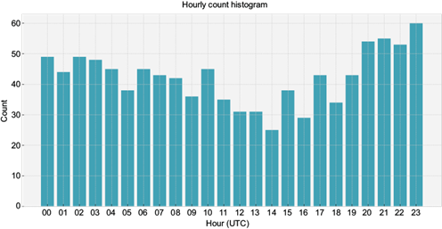 Fig. 3 Histogram of the number of rain and non-rainy days using a PT of 25 by the hour (UTC) of the day for the total study region (black box in figure 1).
