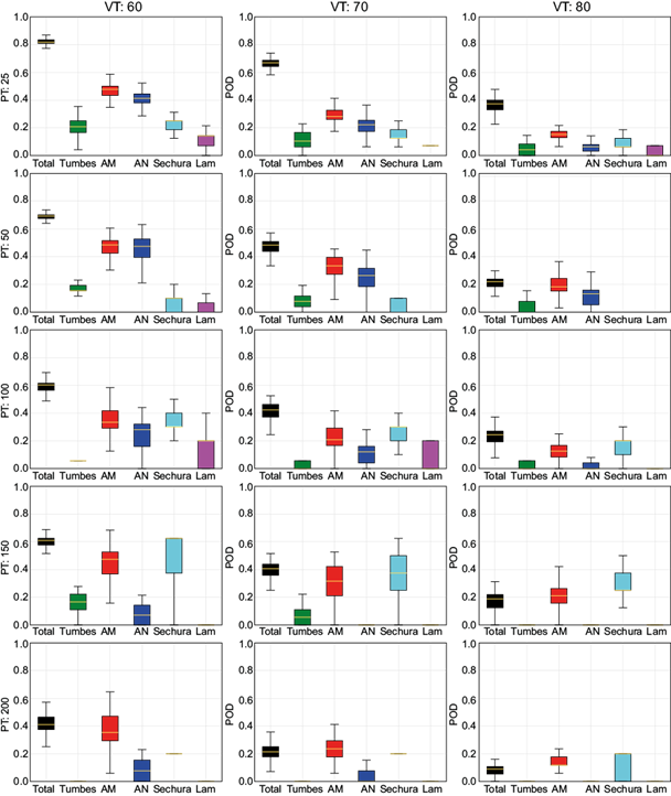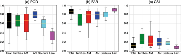 POD values in Figure 8a show that the black region (total area of study) presents higher overall skill than the other sub-regions, although the Amotape Mountains (AM) region also has similar values. The Andes region (AN) presents the smallest variability, with values above 0.6, which indicates that it usually presents successful predictions. The northern Andes in the state of Piura are also heavily influenced by El Niño, making precipitation more frequent and intense, which is what RAMI identifies and, thus, yields a high POD. Conversely, the region with the lowest values of POD is the Lambayeque region (Lam). It is the southernmost point of the NCP, which means that convective precipitation on the coast is not as frequent as in the AM or Tumbes regions. Therefore, its prediction is more complex and may indicate that RAMI struggles more to identify rainfall in this region. FAR values (see Fig. 8b) are highest for the total area, which indicates that RAMI tends to overestimate the precipitation forecast in the NCP. More specifically, in the Lam region, which also presents similar values of FAR but with less variability. As it was mentioned, the Lam region is the more complex one to predict precipitation, therefore, most of the forecasts have fallen into false alarms. The AM region presents the lowest values of FAR (under 0.4), meaning false alarms may not be as frequent as in other regions. This could be explained considering that this is a rainy zone because of orographic lifting by the mountains, leading to fewer instances where RAMI identifies rain and it did not occur. The low values of the CSI (see Fig. 8c) in the total area are due to high values of FAR and low values of CSI given by the Lam region. The best values of CSI are achieved in the AM region, which means that RAMI is best at predicting precipitation in this region, followed by the Tumbes region. Again, the Lam region presents the worst performance of all regions, having the lowest values of CSI, which indicates that RAMI may not be too reliable at that location. Overall, RAMI presents good skill in identifying precipitation with relatively few false alarms for the Tumbes, AM, and AN regions. However, it must be used cautiously in the LAM region where the POD is lowest, the FAR is highest, and the CSI has the worst performance.