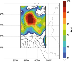 For operational purposes, we suggest that RAMI must be plotted only in the total area (-3.25º to -7º S, -81.5º to -79.5º W) with color-filled contours every four values equal to or above 60, and with solid black contours for values under 60. Figure 7 depicts the proposed color palette and plot settings for RAMI.