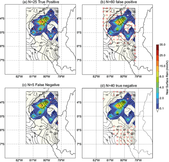 Fig. 9 Graphical representation of the contingency table (Table IV) for February 21, 2017 at 03:00 UTC. (a) True positive grid points depicted by a red “X”. (b) False positive grid points depicted by a red “X”. (c) False negative grid points depicted by a red “X”. (d) True negative grid points depicted by a red “X”. “N” is the number of grid points in each category. Surface rain from GPM is in color-filled contours, and RAMI is in solid black contours. (RAMI: Rivas, Anderson-Frey, McMurdie Index.)