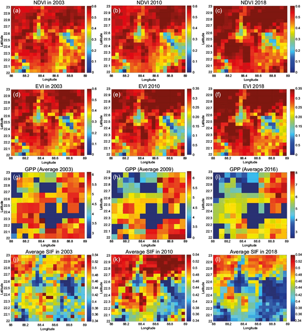 The findings from the analysis of NDVI, EVI, GPP, and SIF data reveal intriguing spatial and temporal patterns in vegetation characteristics and productivity across Kolkata and its surrounding region (Fig 3). Lower NDVI values are observed in highly urbanized and wetland areas, while regions with vegetation cover exhibit higher NDVI values (Fig. 3a-c). Over time, an increase in NDVI concentration is noted in the northeastern and northwestern parts, where agricultural fields and settlements dominate. Conversely, a decreasing trend in NDVI is observed in the eastern part, indicative of rapid urbanization. Similar to NDVI, EVI shows spatial and temporal changes reflecting variations in vegetation greenness. The trends observed in EVI closely mirror those seen in NDVI, with increasing values in vegetated areas and decreasing values in urbanized regions (Fig. 3d-f). GPP values indicate the generation and concentration of carbon during photosynthesis by plants. Higher GPP values are concentrated in the northeastern, southeastern, and western parts, while lower values are found in the northwestern and central to eastern parts (Fig. 3g-i). A decreasing trend in GPP is observed across the study area from 2003 to 2016, possibly influenced by various factors including land use changes and climate variability. SIF serves as a functional proxy of terrestrial GPP. Higher SIF values are observed in the north and lower values in the southern, southeastern, and southwestern corners. Dynamic spatiotemporal changes in SIF are noted, with sharp increases in the north, northeast, northwest, and western parts from 2003 to 2010, followed by a negative change in SIF in all areas from 2010 to 2016 (Fig. 3j-l). These observations underscore the complex interplay between land use dynamics, climate variability, and vegetation productivity in the study area. The findings provide valuable insights for ecosystem management, urban planning, and climate change adaptation strategies tailored to the specific characteristics of Kolkata and its surrounding region.
