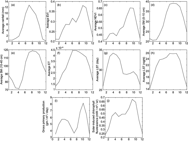 Fig. 5 Monthly variations of average (a) rainfall, (b) EVI, (c) NDVI, (d) SM (0-10 cm), (e) SM (10-40 cm), (f) ET, (g) LST (day), (h) LST (night), (i) GPP, (j) SIF. (EVI: Enhanced Vegetation Index; NDVI: Normalized Difference Vegetation Index; SM: soil moisture; ET: evapotranspiration; LST: land surface temperature; GPP: gross primary productivity; SIF: sun-induced chlorophyll fluorescence.)