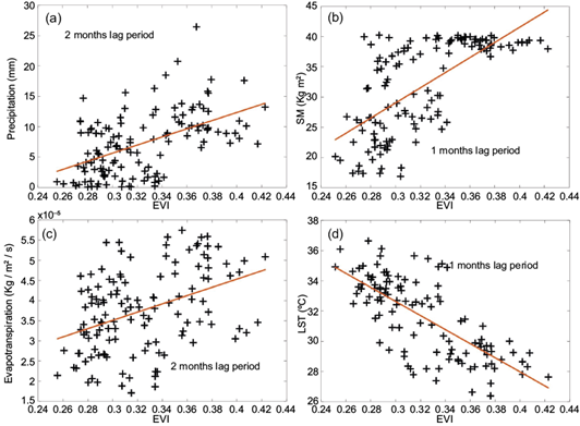 Fig. 9 Best correlation for different lag months of EVI with (a) precipitation, (b) SM, (c) ET, and (d) LST. (EVI: Enhanced Vegetation Index; SM: soil moisture; ET: evapotranspiration; LST: land surface temperature.)
