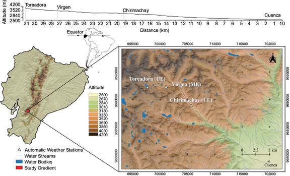 The study area is along an altitudinal gradient between 3298 and 3955 masl, located in southern Ecuador in the Interandean valley and is within the Macizo del Cajas, declared as part of the World Network of Biosphere Reserves (WNBR) by UNESCO in 2013 (Córdova et al., 2016). In addition, Macizo del Cajas provides the water supply to Cuenca (~2500 masl), Ecuador’s third largest city, and other neighboring towns; water originating in the study area is also important for agriculture, industrial activities, and tourism (Célleri and Feyen, 2009).