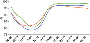 The daily cycle of RH for each station is shown in Figure 10. In the study area, RH reaches its maximum value at night and before sunrise (when the air temperature is the lowest) and its minimum value around noon (when the air temperature is the highest, i.e., the diurnal cycle of RH is inversely related to temperature). Moreover, the increase in atmospheric relative humidity from noon onwards contributes to the afternoon-evening maximum in the frequency of occurrence of stratiform precipitation (such as drizzle and non-showery precipitation) (Dai, 2001; Whiteman, 2001). In general, there is a diurnal variation of RH at every site, which is explained by the fact that the saturation water vapor content that air can hold depends on air temperature (and hence on elevation) while actual water vapor content does not, which is evident in the night hours, when the air temperature drops and remain relative steady (Fig. 8).