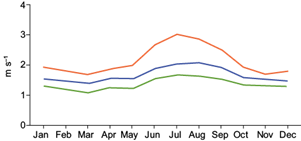 The highest mean monthly wind speed recorded was 3.0 m s-1 in July at UE, and mean monthly wind speeds rose above 2.0 and 1.6 m s-1 between July and August at ME and LE, respectively.
