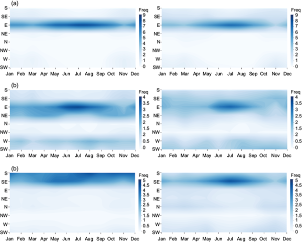 Fig. 12 Change in the prevailing wind direction through the course of the year (relative frequency). Wind direction observations are made during the day (05:00 to 19:00 LST) (left) and night (19:00 to 05:00 LST) (right) at the UE (a), ME (b), and LE (c) weather stations. The relative frequency scale (right-hand y-axis) varies across the three sets of plots.