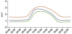 During the daytime, currents rise from the valley floor, sidewalls, and ridge tops and form a deep maximum convective boundary layer that, as mixing occurs within it, produces fairly uniform wind speed throughout the layer and usually peaks around noon (Whiteman, 2001). Thus, the daily cycle of wind speed in our study area shows that stronger winds blow during the daytime, being at a maximum of 3.2 m s-1 at 12:00 LST in UE, 2.8 m s-1 at 11:00 LST in ME, and 2.5 m s-1 at 12:00 LST in LE (Fig. 13). In general, wind speed increases with altitude and during the morning transition period that begins shortly after sunrise (05:00 LST).
