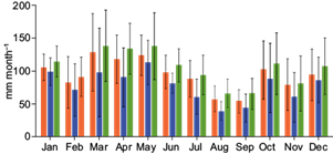 Fig. 2 Long-term mean (2013-2023) of the rainfall annual cycle at UE (orange), ME (blue), and LE (green). Error bars represent the standard deviation of the mean.
