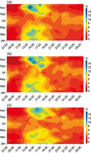 Fig. 4 Average diurnal cycle of hourly rainfall through the annual cycle as a percent of total daily rainfall at the UE (a), ME (b), and LE (c) weather stations in LT (UTC-5).