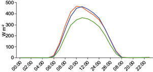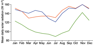 Fig. 5 Annual cycle of mean daily incident solar radiation at the UE (orange), ME (blue), and LE (green) weather stations.