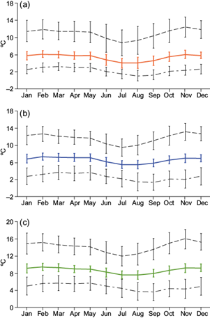 Fig. 7 Seasonal variation of the mean minimum (dot-dash curve), mean (solid curve), and mean maximum (long dash curve) air temperatures at the UE (a), ME (b), and LE (c) weather stations. Error bars represent the standard deviation of the mean.