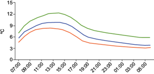 The daily cycle of air temperature for each station is shown in Figure 8. During daytime, solar radiation passes through the atmosphere, is received on the ground and is converted to sensible heat flux, which increases the air temperature adjacent to the surface, leading to the development of the convective boundary layer (Whiteman, 2001; Yang and Slingo, 2001; Seo and Dirmeyer, 2022). Thus, temperature reaches its maximum between 12:00 and 13:00 LT at UE (8.30 ºC), 13:00 LST at ME (9.85 ºC), and 14:00 LST at LE (12.27 ºC). On the other hand, temperatures are lowest from 04:00 to 06:00 LT in every site.