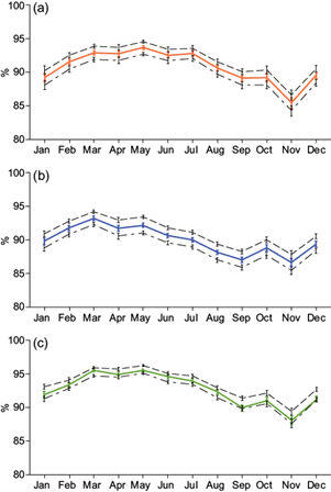 Fig. 9 Seasonal variation of the absolute daily minimum (dot-dash curve), mean daily (solid curve), and the absolute daily maximum (long dash curve) relative humidity at the UE (a), ME (b), and LE (c) weather stations. Error bars represent the standard error of the mean.