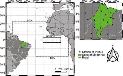 The study area comprises the TA region (Fig. 1a) and the state of Maranhão (Fig. 1b). The dashed rectangles in Fig. 1a represent the regions of the NTA (5.5º-23.5º N; 57.5º-15º W) and the STA (0º-20º S; 30º W-10º E), where the years of occurrence of the AMM (Moura and Shukla, 1981) were estimated. The solid rectangle in the same figure represents the ATL3 region (3º N-3º S, 20º W-0º E), where the years of occurrence of the Atlantic Niño were estimated.