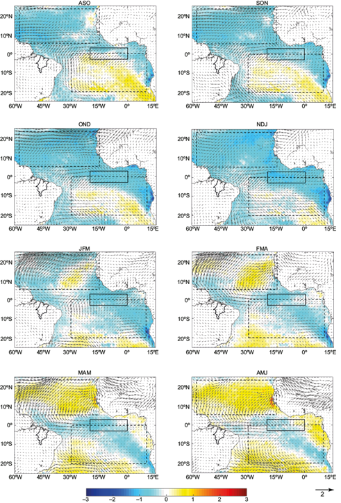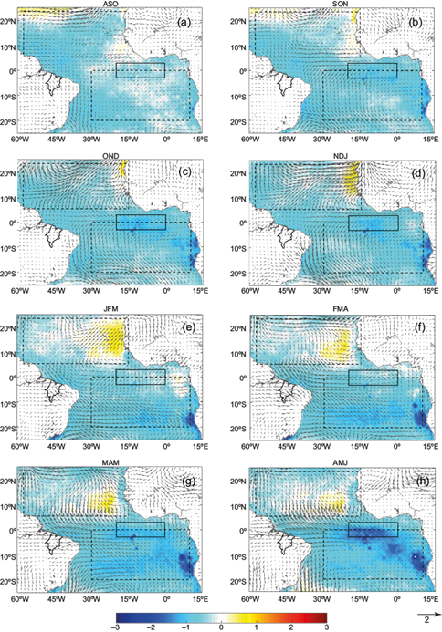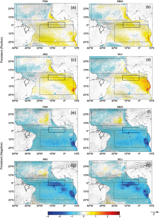 Fig. 6 Spatial evolution of quarterly sea surface temperature (SST) anomalies (ºC) and 10-m wind (m s-1) in the tropical Atlantic during positive (a-d) and negative (e-h) persistent events.