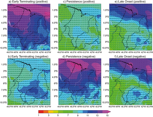 A plausible explanation for this unexpected increase in precipitation during the negative phase of the early termination event may be related to the intensification of moisture flux transported from the ocean to the continent by equatorial winds. Additionally, the possible influence of the La Niña phenomenon that occurred in 2005 may have contributed to this pattern. This analysis highlights the complexity of climate interactions in the Maranhão region and underscores the importance of considering multiple factors, including local and remote climate modes and extreme events of atmospheric systems, for a more comprehensive understanding of precipitation patterns and climate variability in this area.