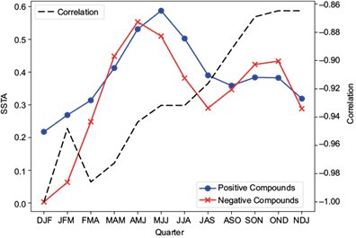 From the quarterly precipitation anomalies in Maranhão and the quarterly TSM anomalies in the ATL3 region, the mean compounds of the years and quarters that characterized the occurrence of different types of Atlantic Niño for both negative and positive phases were calculated. Precipitation compounds were constructed for the late onset, early termination, and persistent events only.