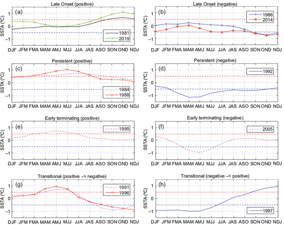 Fig. 3 Temporal evolution of the ATL3 index during the years of Atlantic Niño occurrences between 1980 and 2020, classified as (a) positive early termination, (b) negative early termination, (c) positive persistent, (d) negative persistent, (e) positive late onset, (f) negative late onset, (g) positive transitional, and (h) negative transitional. The dashed black lines represent the sea surface temperature (SST) anomaly thresholds (SSTAs) for positive (> +0.5 ºC) and negative (< -0.5 ºC) events.