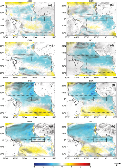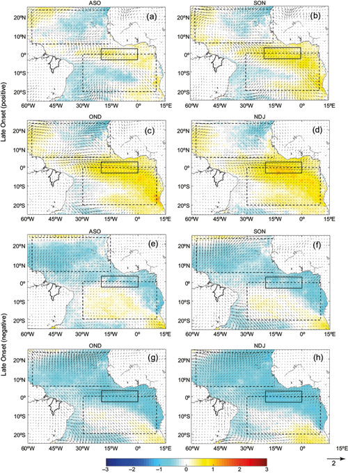 Fig. 4 Spatial evolution of quarterly sea surface temperature (SST) anomalies (ºC) and 10-m wind (m s-1) in the tropical Atlantic during positive (a-d) and negative (e-h) late onset events.
