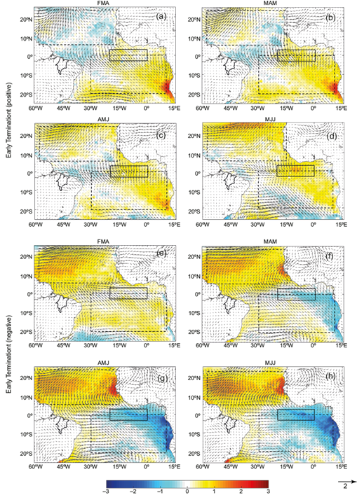 Fig. 5 Spatial evolution of quarterly sea surface temperature (SST) anomalies (ºC) and 10-m wind (m s-1) in the tropical Atlantic during positive (a-d) and negative (e-h) early termination events.