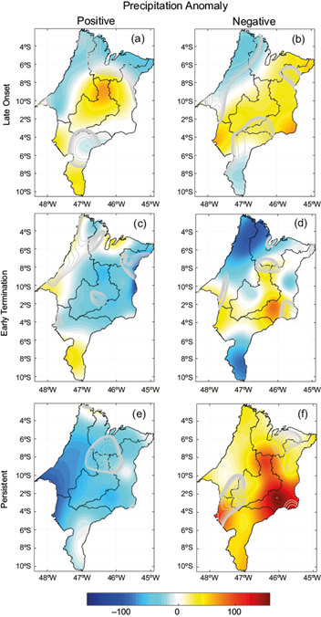 Fig. 8 Average quarterly precipitation anomalies (mm) in the state of Maranhão during positive (first column) and negative (second column) events in years of Atlantic Niño occurrences of the following types: (a-b) late onset, (c-d) early termination, and (e-f) persistent. Gray lines indicate statistically significant values at the 95% level.