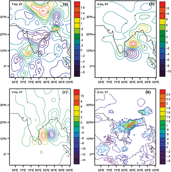 Fig. 1 Analysis increment in (a) temperature (in K), (b) u-wind (in m s-1) (c) v-wind (in m s-1), and (d) moisture (in kg kg-1) after assimilation of satellite vdata at 00:00 UTC on May 16, 2020.