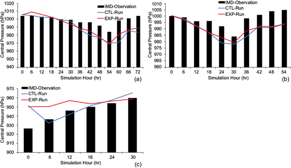 Figure 10 shows the CP variation at different ICs for SCS Nisarga. In the simulation from the IC at 00:00 UTC on June 1, 2020, shown in Figure 10a, it is evident that CTL-run and EXP-run initially exhibited values of 1005.5 and 1005.4 hPa, respectively. However, after 18 h of simulation, EXP-run CP values align more closely with the IMD observation compared to the CTL-run. Moreover, the decrease in CP at a lead time of 54 h is well depicted in the EXP-run, close to the IMD CP observation. Similarly, for the simulation at 00:00 UTC on June 2, 2020, Figure 10b shows that the EXP-run CP value is in closer agreement with the IMD observed value than CTL-run. Additionally, the decrease in CP at the 30-h simulation lead time is more accurately represented in EXP-run compared to CTL-run. For the simulation at 00:00 UTC on June 3, 2020, Figure 10c shows a slight peak at the 12-h simulation, as observed by the IMD, which is well captured by EXP-run compared to CTL-run. Furthermore, the overestimation of low pressure displayed in the CTL-run plot at the 6-h simulation is effectively reduced in EXP-run.
