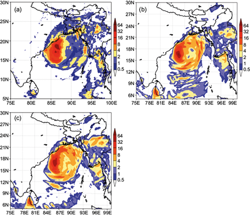 In recent years, several model performance assessment studies for TC predictions have been conducted across different regions (Singh et al., 2005; Kumar et al., 2007; Sandeep et al., 2007; Srinivas et al., 2013; Dhanya et al., 2016; Dodla et al., 2016; Islam et al., 2016; Alimohammadi and Malakooti, 2018; Singh and Prasad, 2019). Sandeep et al. (2006) indicated that applying nudging to ingest conventional meteorological and assimilate microwave-sounding data resulted in an improvement in the wind asymmetries simulation and warm temperature anomalies. Islam et al. (2016) used a three-dimensional variational DA (3D-var) method to present an assimilation effect analysis for hurricane Sandy forecasting and concluded that assimilation of AMSU-A satellite radiances improves the short-to medium-range forecast (up to a 60 h lead time), but degrades the forecast skill in the long-range forecast (beyond 60 h). Dodla et al. (2016) assessed the impact of DA by comparing Weather Research and Forecasting (WRF) model simulations with and without DA for predicting TC Phailin (2013); they reported that the DA experiment yielded the best estimate, with errors depending on the availability of satellite data and conventional observations used for DA. Fatmasari et al. (2019) compared the effect of DA on rainfall prediction for convective precipitation and the IC of the model regarding the heavy rainfall event that occurred on February 24, 2016, in Jakarta, showing that the assimilation of satellite radiance data is best able to characterize convective rain patterns and has a higher precision on convective rainfall accumulation per hour. Using WRF DA, Xu et al. (2013) evaluated the effect of assimilating Infrared Atmospheric Sounding Interferometer (IASI) radiance observations on Typhoon Megi (2010) and Hurricane Maria (2011). Sandeep et al. (2007) demonstrated that an improvement in the simulation of wind asymmetries and the warm temperature anomalies of TCs was observed on ingesting and assimilating microwave sounding from AMSU and the conventional meteorological data through nudging. Bao et al. (2015) assessed the influence of AMSU-A/MHS and IASI DA on temperature and humidity forecasts over the western United States. Zou et al. (2017) showed that combining AMSU-A and MHS radiances into one data stream for their assimilation for precipitation forecasts led to forecast skill improvement over a 10-day period when hurricanes made landfall. Several studies have used mesoscale models to simulate TCs and depressions in the North Indian Ocean (NIO) area (Trivedi et al., 2002; Mohanty et al., 2004). Many of these studies focused on extremely severe systems, such as the Orissa super cyclone, which formed in 1999; thus, understanding the DA effect on super cyclones that formed in other years is crucial.