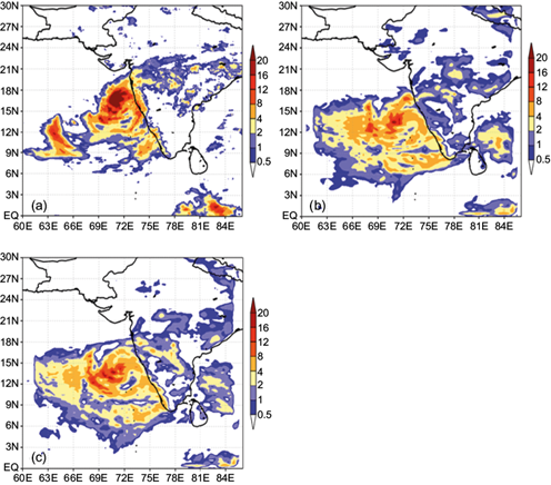 Fig. 11 (a) Daily accumulated rainfall (cm day-1) from IMERG on May 20, 2020, and 72-h simulated rainfall (cm day-1) from (b) CTL-run and (c) EXP-run, valid on May 20, 2020, for SuCS Amphan.