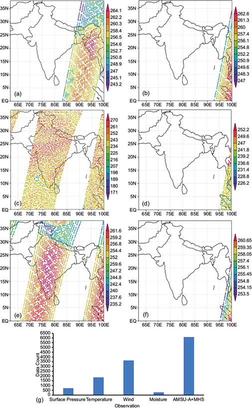 The analysis increment of the initial temperature varies from -0.8 to 1.6 K; u- and v-wind vary from -10 to 12 m s-1 and -14 to 10 m s-1, respectively, and moisture varies from -0.6 to 2.4 kg kg-1. Figure 1a shows a positive increment in temperature near the Kolkata-Bangladesh region and south of the AS region. There is a positive analysis increment in u-wind over the northern BoB and a negative analysis increment over the southern BoB, as shown in Figure 1b. Similarly, there is a positive analysis increment in the southwestern region of thr BoB, and a negative analysis increment in the region between 85º E to 95º E over the central BoB was observed for v-wind (shown in Fig. 1c). The positive analysis increment is also noted for the moisture field (around 2.4 kg kg-1) around the eastern coast of India near to the cyclonic region (shown in Fig. 1d). Figure 2a-f gives an example of the spatial distribution of satellite observations from AMSU-A and MHS in different platforms. Figure 2g shows the total conventional and satellite observations used for the assimilation at 00:00 UTC on May 16, 2020, for SuCs Amphan.