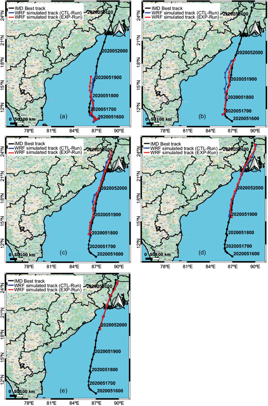 Fig. 3 Simulated tracks from CTL-run and EXP-run for (a) 72 h from the IC at 00:00 UTC on May 16, 2020, (b) 72 h from the IC at 00:00 UTC on May 17, 2020, (c) 72 h from the IC at 00:00 UTC on May 18, 2020, (d) 60 h from the IC at 00:00 UTC on May 19, 2020, and (e) 36 h from the IC at 00:00 UTC on May 20, 2020, along with IMD’s best track for SuCS Amphan.
