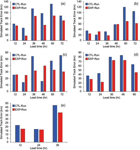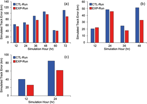 The track errors of both runs were computed with respect to the best track positions provided by the IMD. If the average simulated track error of the CTL run is designated as E CTL and the average simulated track error of the experiment run is designated as E EXP , the percentage improvement can be obtained as follows: